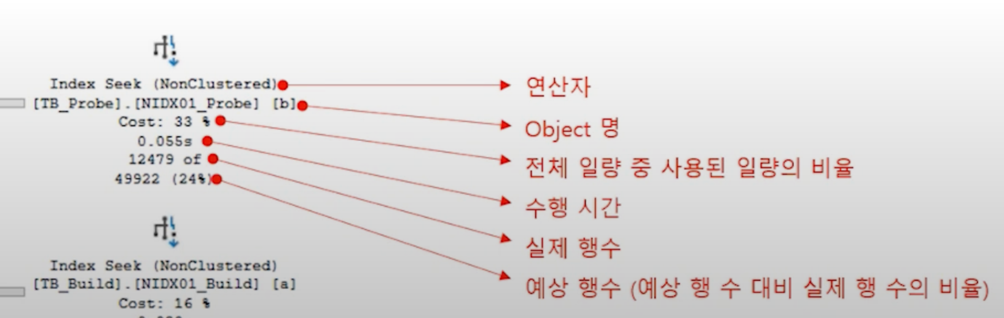 - 예상실행계획 : 각 연산자의 속성 정보를 통해 SQL이 수행되기전에 미리 계획을 확인할 수 있다. (실제와 차이가 있을수 있다)