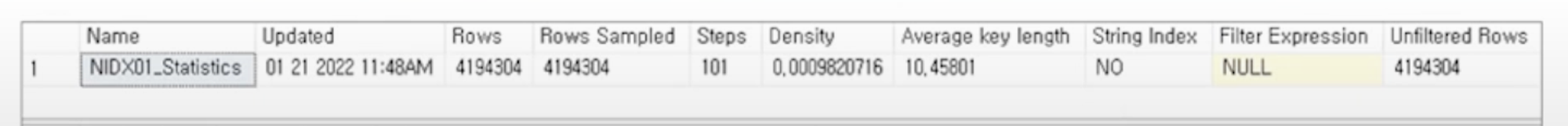 - 통계의 상세정보, 열들에 대한 밀도 벡터, 단일 열( 또는 인덱스의 선두 키 )의 데이터 분포를 나타내는 히스토그램을 포함한다