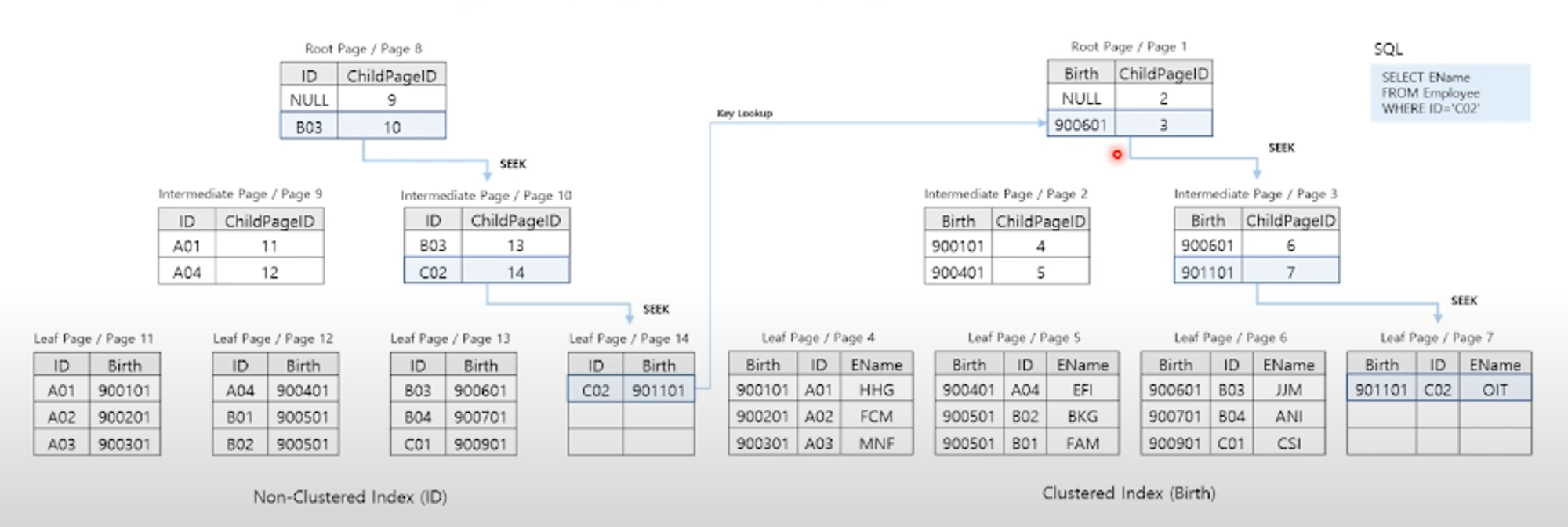 - 인덱스의 RID 대신 Clustered 인덱스 키 값을 가지고 탐색