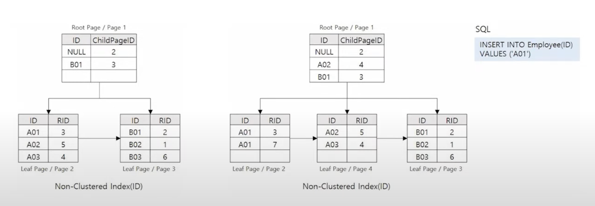 - 인덱스 재작성 : 기존 인덱스를 삭제하고 새로운 페이지를 할당받아 재 생성