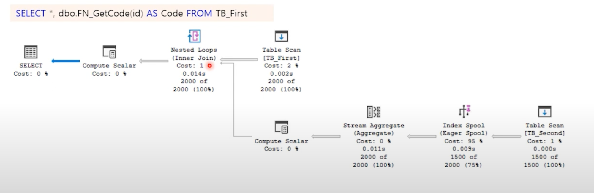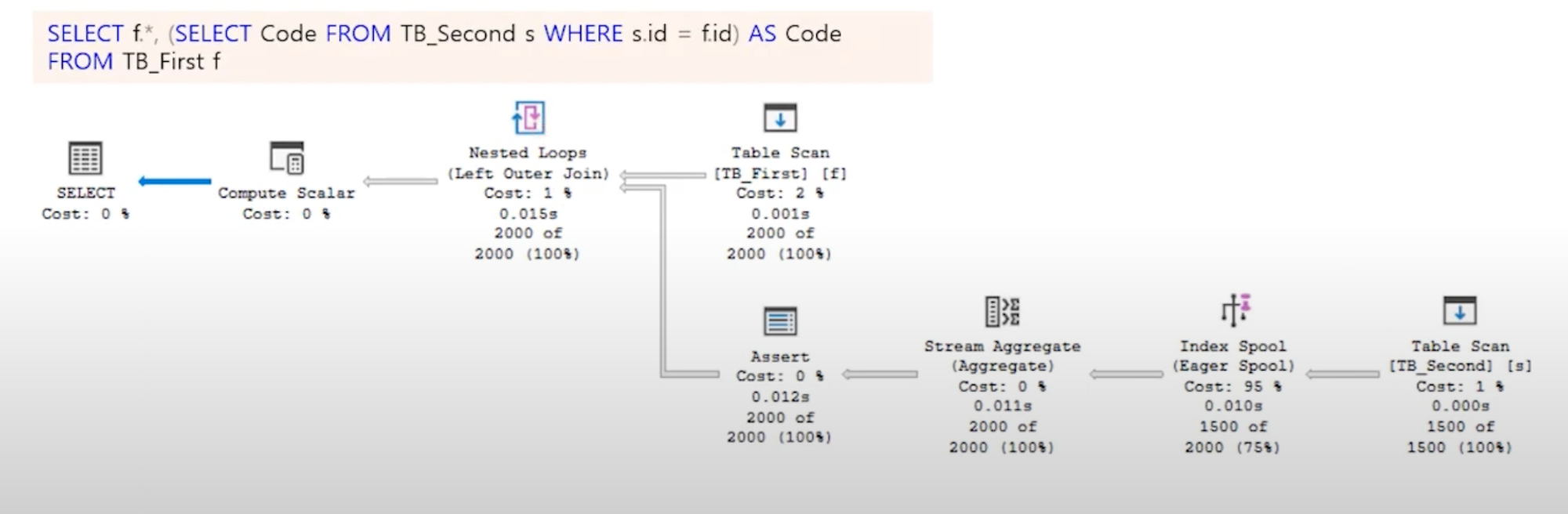 - 스칼라 함수와의 차이점 : 메인 쿼리와 조인조건을 기준으로 OUTER JOIN된다는 것이다.