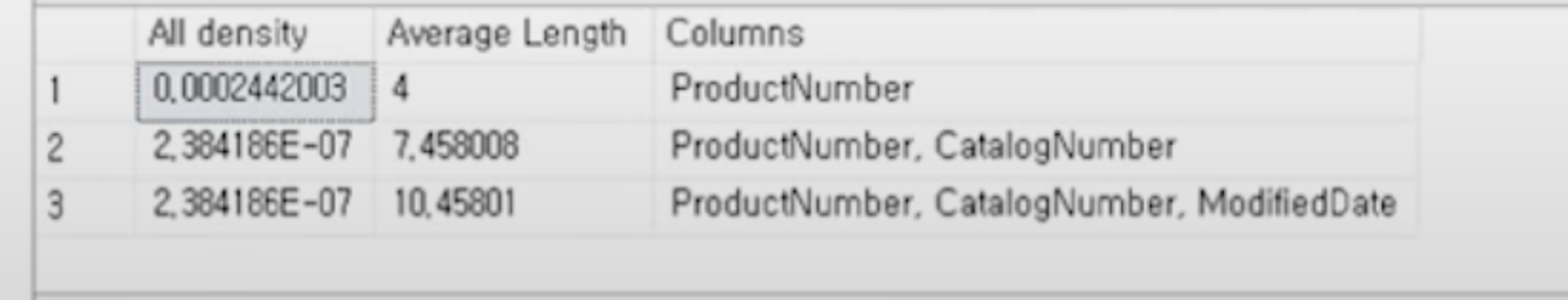 - 정의 : 단일컬럼과 결합 컬럼들의 밀도와 평균 길이를 표기한다.