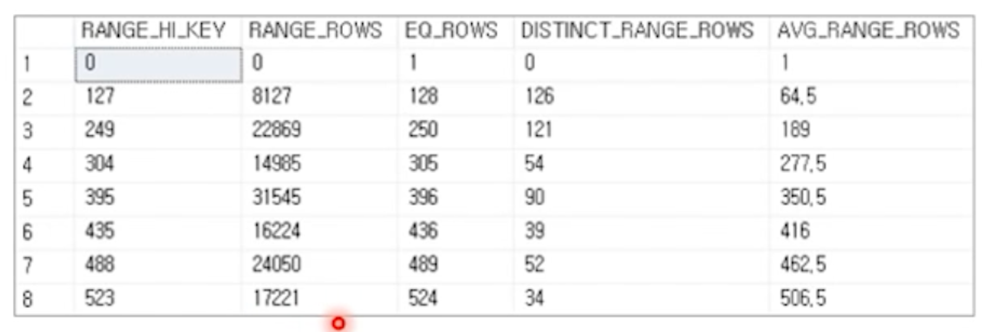 - DISTINCT_RANGE_ROWS : 상한 값을 제외한 값들의 중복 제거한 데이터 수를 의미한다