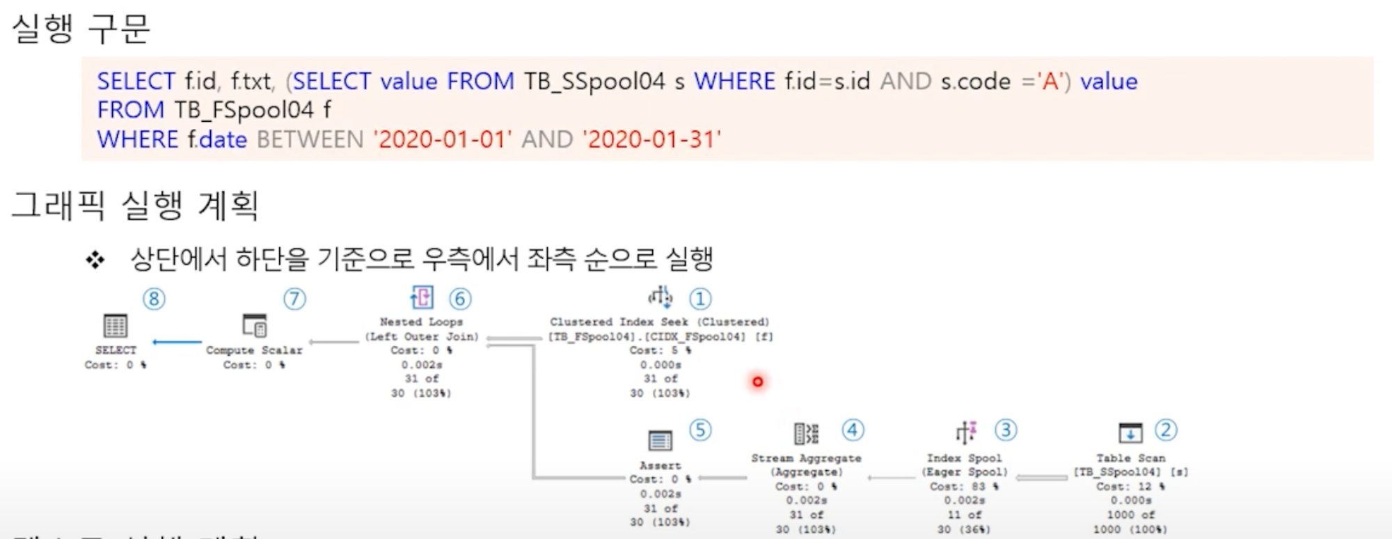 - 예상 실행 계획 : 각 연산자의 속성 정보를 통해 SQL이 수행되기전에 미리 계획을 확인할 수 있다. (실제 실행계획과 차이가 있을 수 있다.)