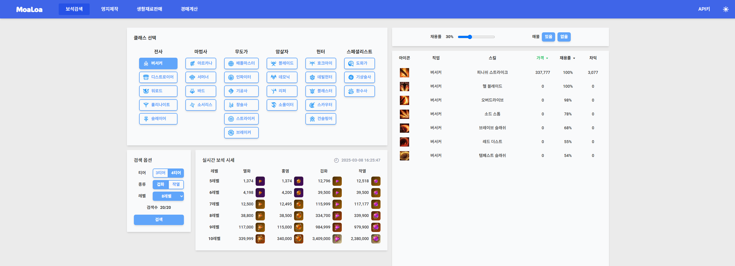 - 모아로아 서버로 부터 받은 보석시세와 api키를 이용하여 받은 스킬별 보석시세의 차액을 계산하여 정렬하여 보여준다.
