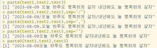 paste(text1,text2,text3) # sep= ' ' 기본값