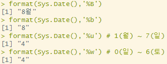 format(Sys.Date(), '%w') # 일 0 ~ 토 6