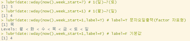 lubridate::wday(now(),week_start=1,label=F) # label=F 기본값