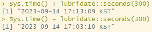 Sys.time() + lubridate::seconds(300)