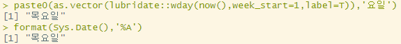 paste0(as.vector(lubridate::wday(now(),week_start=1,label=T)),'요일')