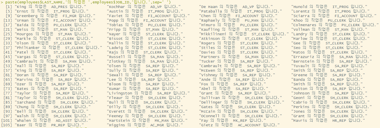 paste(employees$LAST_NAME,'의 직업은 ',employees$JOB_ID,'입니다.',sep=' ')