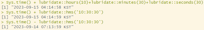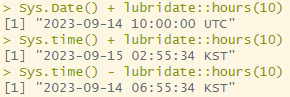 Sys.Date() + lubridate::hours(10) # Sys.Date()는 내부적으로 0시 0분. 10시간을 더하면 10:00시로 나옴.