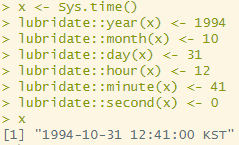 lubridate::minute(x) <- 41 # 분 수정