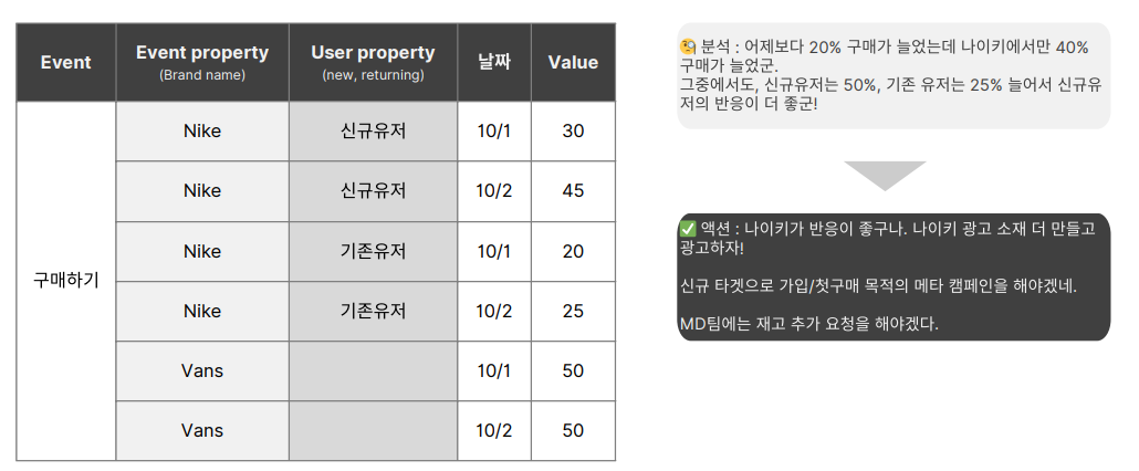 브랜드이름(=Event Property), 유저가 기존유저인지 신규유저인지(= User Property)를 함께 본다면