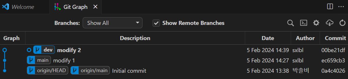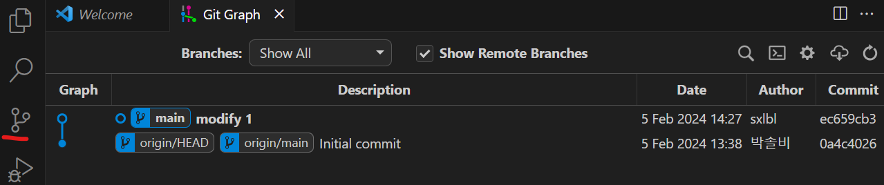 - Main Branch ์์ ์์ ํ ๋ด์ฉ์ commit ํ ๋ค Remote Server ์ ๋น๊ต