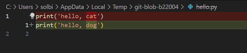 ํ์ฌ ๋ฉ์ธ branch์ ๊ฒฝ์ฐ hello.py ๋ด์ฉ์ด hello, cat