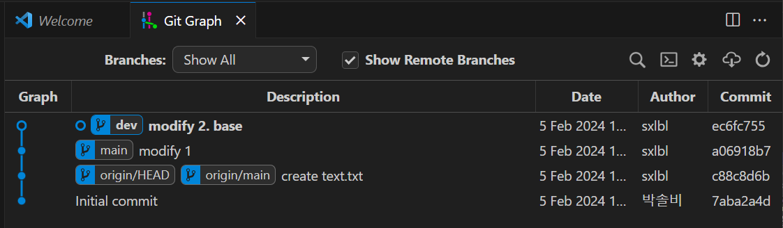 - Main Branch ์์ ํ์ผ ์์ ํ ๋ง์ง๋ง commit ํ ๋ด์ฉ๊ณผ ๋น๊ต