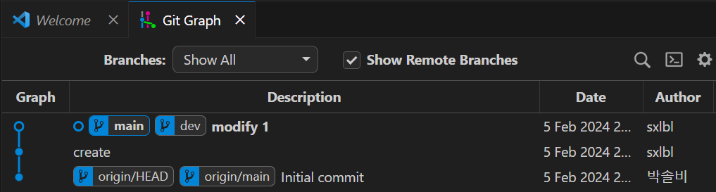 • [main] 에서 Branch 생성 (이동 X) : dev2