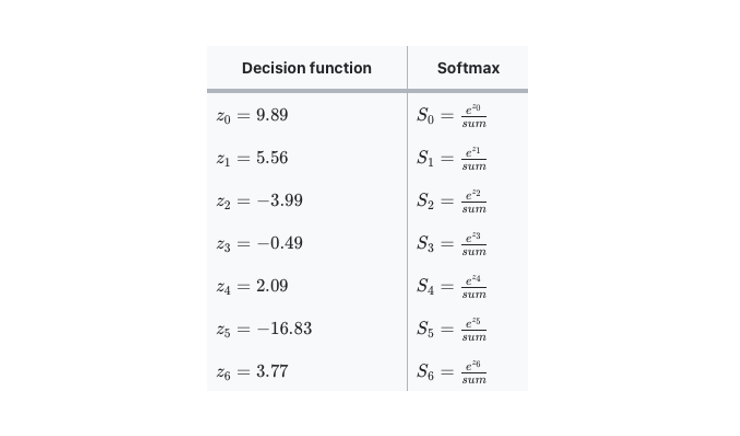 Softmax 는 각 행의 z 값을 exponential function 에 적용한 후 sum = 으로 각각을 나누어 결국 총합이 1이 되도록 한다. 예를 들어 test_scaled[0] 의 decision function 은 아래와 같다면 각각의 softmax 값은 다음과 같다.
