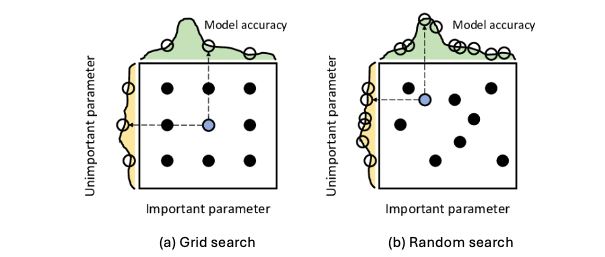 Grid search 는 일정하게 매개변수 값을 바꿔가며 매번 교차검증을 수행해준다. 반면에 다음 글에서 다룰 random search 는 말 그대로 probability distribution 에 따라 독립적으로 고른 hyperparameter 를 바탕으로 tuning 한다.