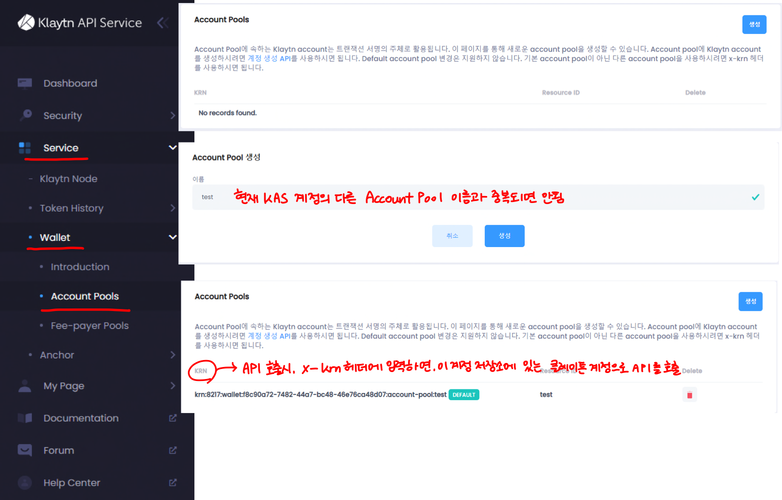 KAS 콘솔 -> Service -> Wallet -> Account Pools 메뉴