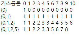 결론적으로 6원에서 5원을 뺀 1원을 만들 수 있는 {1,2}원의 조합이 5를 꼭 포함해서 6을 만들 수 있는 조합이 된다.