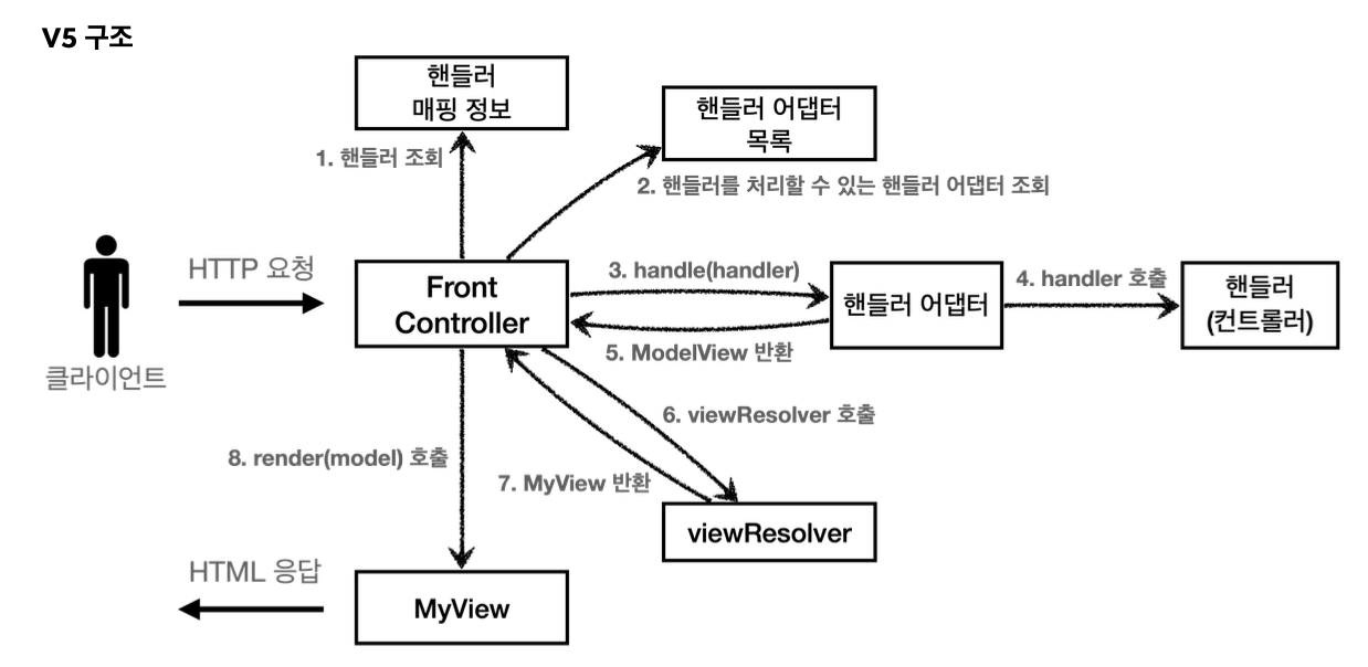 handler를 컨트롤러 V3로 변환한 다음에 V3 형식에 맞도록 호출supports()를 통해 ControllerV3만 지원하기 때문에 타입 변환은 걱정없이 실행해도 됨ControllerV3는 ModelView를 반환하므로 그대로 ModelView를 반환하면 됨package hello.servlet.web.frontcontroller.v5;