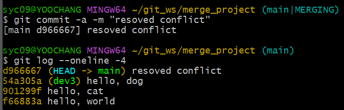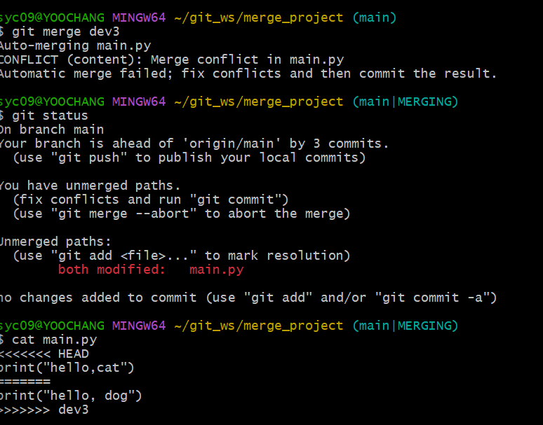 push 때 merge는 remote 서버에서 일어남(remote 서버에는 해결해줄 사람이 없음. auto merge만 가능. push를 받아주지 않음)