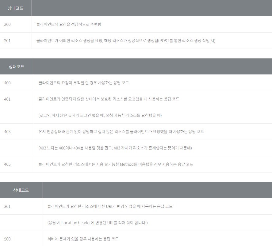 마지막으로 응답 상태 코드를 간단히 살펴보도록 하겠습니다. 잘 설계된 REST API는 URI만 잘 설계된 것이 아닌 그 리소스에 대한 응답을 잘 내어주는 것까지 포함되어야 합니다. 정확한 응답의 상태코드만으로도 많은 정보를 전달할 수가 있기 때문에 응답의 상태코드 값을 명확히 돌려주는 것은 생각보다 중요한 일이 될 수도 있습니다. 혹시 200이나 4XX 관련 특정 코드 정도만 사용하고 있다면 처리 상태에 대한 좀 더 명확한 상태코드 값을 사용할 수 있기를 권장하는 바입니다.