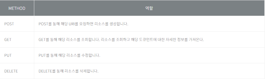 다음과 같은 식으로 URI는 자원을 표현하는 데에 집중하고 행위에 대한 정의는 HTTP METHOD를 통해 하는 것이 REST한 API를 설계하는 중심 규칙입니다.
