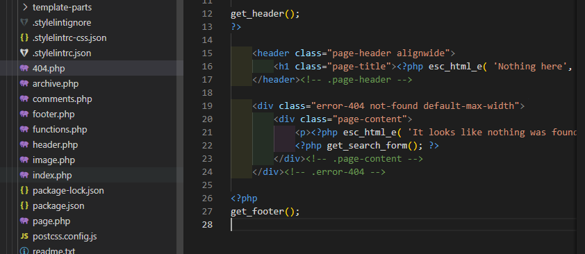get_header();와 내용, get_footer();로 구성된다.404.php