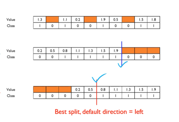 결측치를 양방향으로 보내보면서 split을 해보고 가장 최적의 split point로 분류 후 결측치에 대한 의사결정을 한다.
