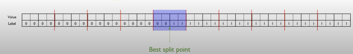 40개의 데이터 포인트에 대해 순차적으로 하나하나 gradient를 계산하며 최적인 split point를 찾았다면 39번의 비교를 했어야한다. 그러나 빨간 줄로 나뉜(for bucket) 데이터 그룹을 기준으로 계산을 했다면 총 10개의 bucket에서 3번의 비교만 한다면 최적 split point를 발견할 수 있다.