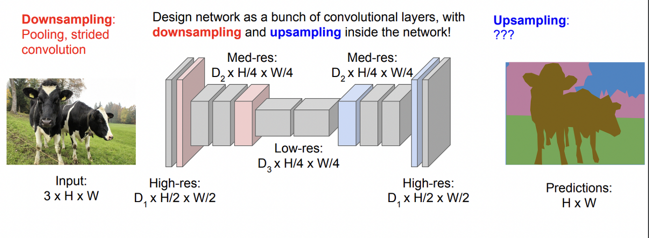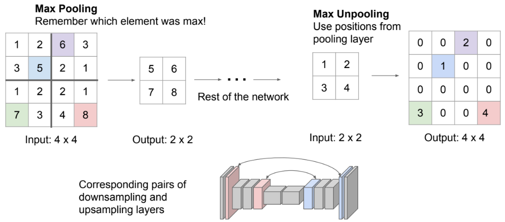 낮은 해상도(resolution)의 이미지를 더 높은 해상도로 변환하기 위해. Max Unpooling 대부분의 네트워크가 downsampling 과정을 거칠 때 Maxpooling 과정을 거치는데 네트워크가 주로 대칭적인 특징을 가지고 있어 그 위치로 Upsampling을 해줘야 한다.