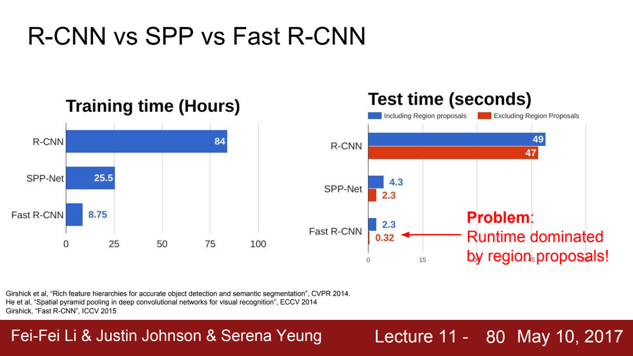 R-CNN에서는 ROI마다 ConvNet을 따로 적용하기 때문에 연산 시간이 매우 길었다. 반면, Fast R-CNN에서는 전체 이미지를 한 번에 Conv Net에 통과시키므로 연산 시간을 단축 시켰다.