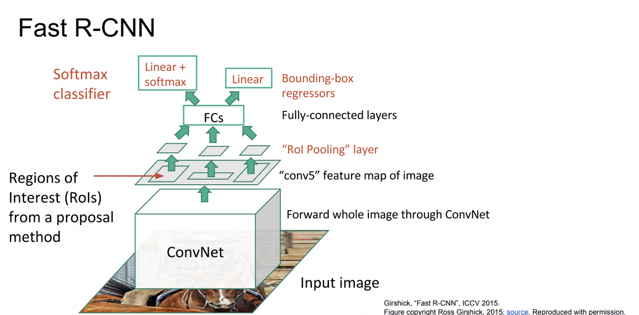 r - cnn에서 계산 비용이 많이 드는 이유를 각각의 ROI 영역에서 cnn과정을 진행했기 때문이라고 생각하고 fast r-cnn에서는 input 이미지에 대해 한 번의 cnn과정을 거친다. 이미지를 통째로 COnv Net에 넣어 추출한 feature map에서 ROI(Regions of Interest)를 추출한다. 나머지 과정은 r-cnn과 동일하다.