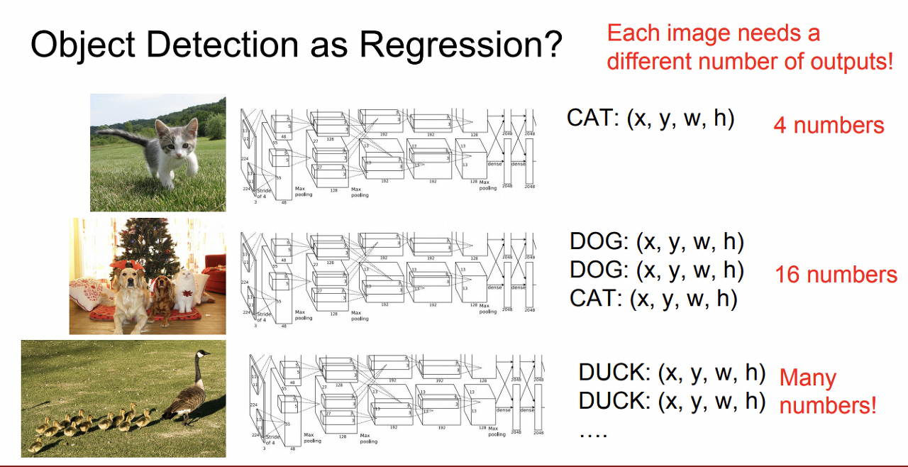 단점: output의 개수가 정해져 있지 않아서 어렵다. 좌표를 regression으로 예측하는 것도 까다롭다.