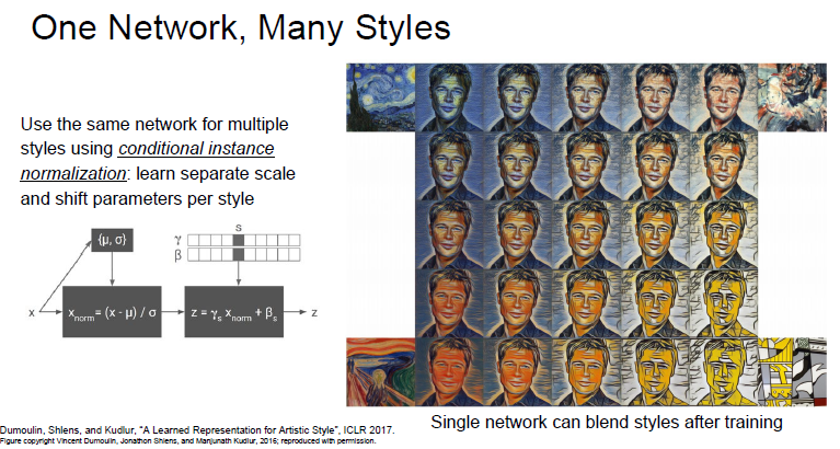 구글에서는 위 단점을 보안한 Content Image와 Style Image를 동시에 넣는 방식으로 다양한 스타일을 만들어 내는 논문을 제안했다. 합성하고자하는 이미지의 최적화를 전부 수행하는 것이 아니라 content image만을 입력으로 받아서 단일 네트워크를 학습시켰다. 이 네트워크 학습시에는 content loss와 style loss를 동시에 학습시키고 네트워크의 가중치를 업데이트 시킨다. 학습은 좀 걸리지만 한 번 학습시키고 나면 이미지를 네트워크에 통과시켜 바로 결과를 볼 수 있다.
