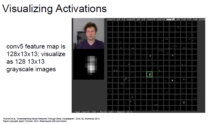 AlexNet의 conv5 activation map에서, 사람 사진을 입력했을 때 얼굴의 모양과 위치가 비슷한 image를 확인할 수 있었다. 활성화 맵을 통해서 이미지의 특징들이 추출되는 것을 확인할 수 있다.