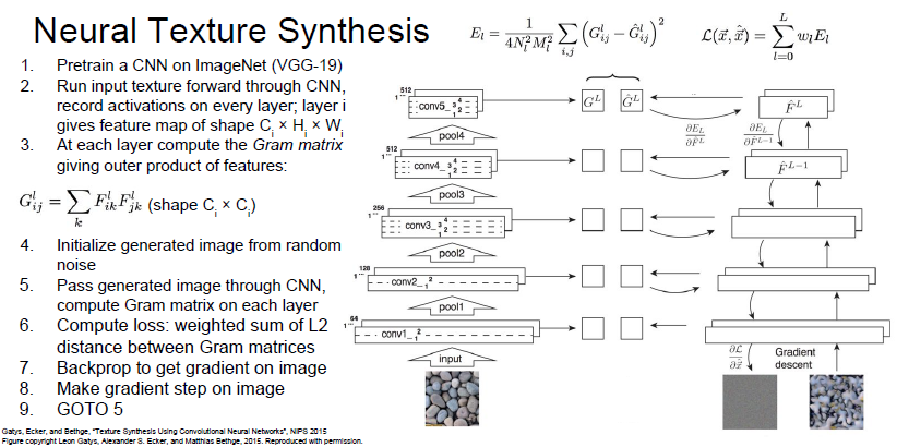 content image의 feature reconstruction loss와 style image의 gram matrix reconstruction loss를 동시에 최소화하여 최종 이미지를 만든다. Style transfer는 deep dream보다 생성 control가 많아진다. 즉 deep dream보다 사용자가 결과물에 더 큰 영향을 줄 수 있다.