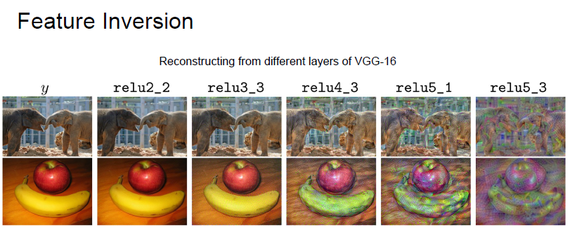 이미지에서 특정 layer에서 activation map을 추출한 후, 이 activation map으로 이미지를 재구성한다. 이 방법에서 gradient ascent을 활용한다. score를 최대화하는 방법 대신 벡터의 거리가 최소화되는 방향으로 update한다. 새로 생성한 이미지의 특정 벡터와 기존에 계산한 특정 벡터(activation map에서 추출한 특징 벡터)의 거리를 측정하는 것.