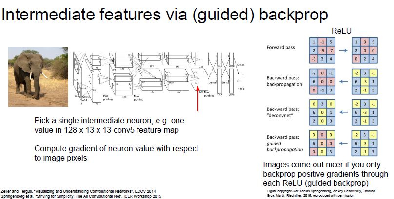 gradient ascent 방법은 반대로 네트워크의 Weight를 고정을 시킨 후, 해당 뉴런을 활성화 시키는 General한 입력 이미지를 찾아내는 방법이다. (가중치값은 고정이지만 입력 이미지의 픽셀값은 유동적이라 이미지가 특정 뉴런 값을 최대화시키는 방향으로 생성되도록 한다.)