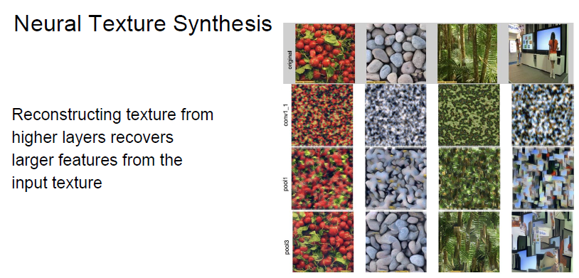 얕은 layer에서 생성한 gram matrix로 만든 이미지는 공간적인 구조를 잘 살리지 못했다. 좀 더 깊은 layer에서 생성한 gram matrix로 만든 이미지는 텍스처 합성이 잘 된 모습을 보인다.