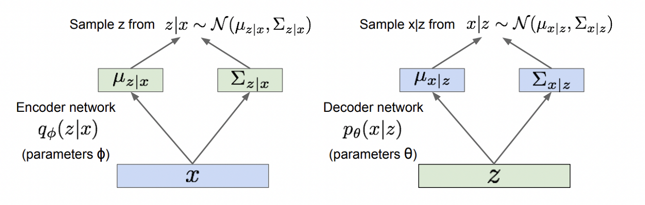 딥러닝과 베이지안 추론을 결합한 생성 모델. 위 PixelRNN/CNN은 계산이 가능한 확률모델 기반인 반면, VAE는 직접 계산이 불가능한 (intractable한) 확률 모델 기반이다. AE(AutoEncoder)와 유사한 구조이지만 여기에 확률론적 의미가 추가된다.