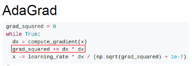 가속도가 아닌 기울기의 제곱값을 이용. 학습중에 기울기의 제곱값을 grad_squred에 계쏙 더해나가서 update step에서 나눠 준다.