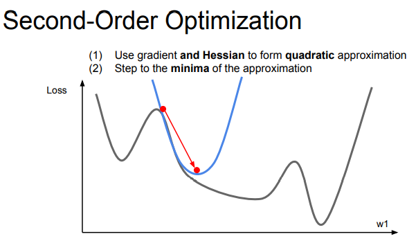 loss의 최저점을 찾아갈 때 2차 근사하면 더 빨리 최저점에 도착할 수 있다. (사진의 빨간 점 비교)