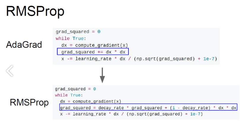 grad_squard를 똑같이 이용하지만 rmsprop은 train하는 동안에 값을 계속 축적함. (decay값을 삽입)