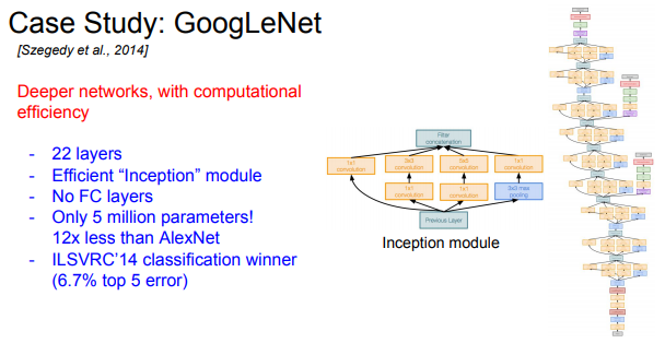 GoogLeNet은 높은 계산량을 효율적으로 수행할 수 있도록 네트워크가 디자인되었다. GoogLeNet은 Inception module을 사용한다. 이 모듈을 여러 개 쌓아서 만들고, FC-Layer는 없다(파라미터를 줄이기 위해 제거함). 전체 파라미터 수가 5백만개로 AlexNet에 비해 적은 수다.