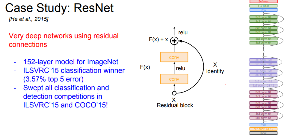 2014년의 GoogLeNet이 22개 층으로 구성된 것에 비해, ResNet은 152개의 층(약 7배)을 갖는다. 깊은 신경 망을 효과적으로 학습 시킬 수 있는 구조를 제안한 모델. 기존의 딥러닝 모델은 layer를 깊게 쌓을수록 최적화가 어려운 단점이 있다. resnet은 이런 문제를 해결하기 위해 일부 레이어에 Residual Connection을 도입하여 정보 손실을 최소화하면서 network를 깊게 만들었다.