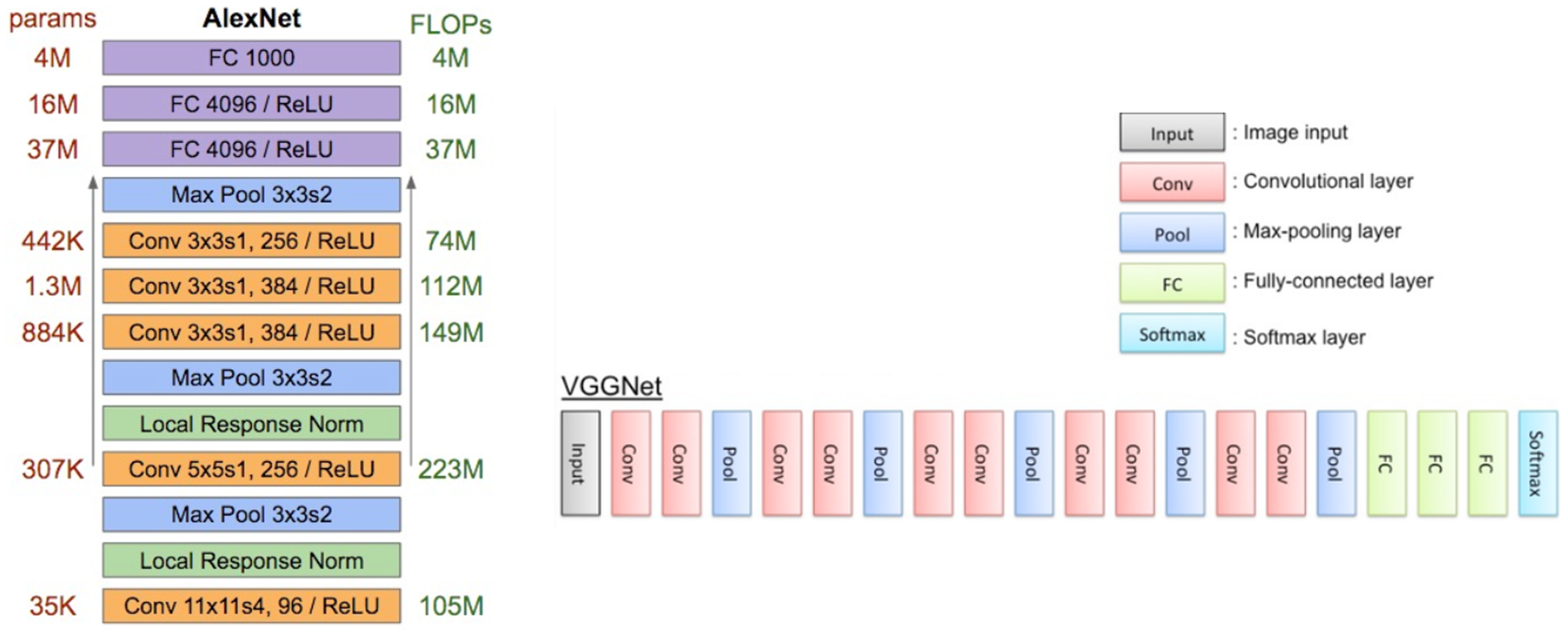 기본적으로 conv-pool-normalization 구조가 두 번 반복, 그리고 뒤에 conv layer가 조금 더 붙고 그 뒤에 pooling layer가 있다. 마지막엔 FC-layer가 몇 개 붙는다.